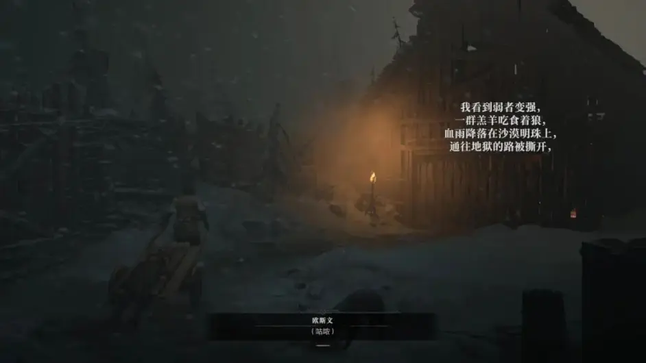 尤其是序章中被“熱情好客”的村民們一頓款待,當暴風雪中村民拉著板車,嘴裡哼唱著古老的歌謠,畫面右側浮現出詩歌般的字幕,那種來自邪教的怪異感覺油然而生,給我留下了深刻的印象。