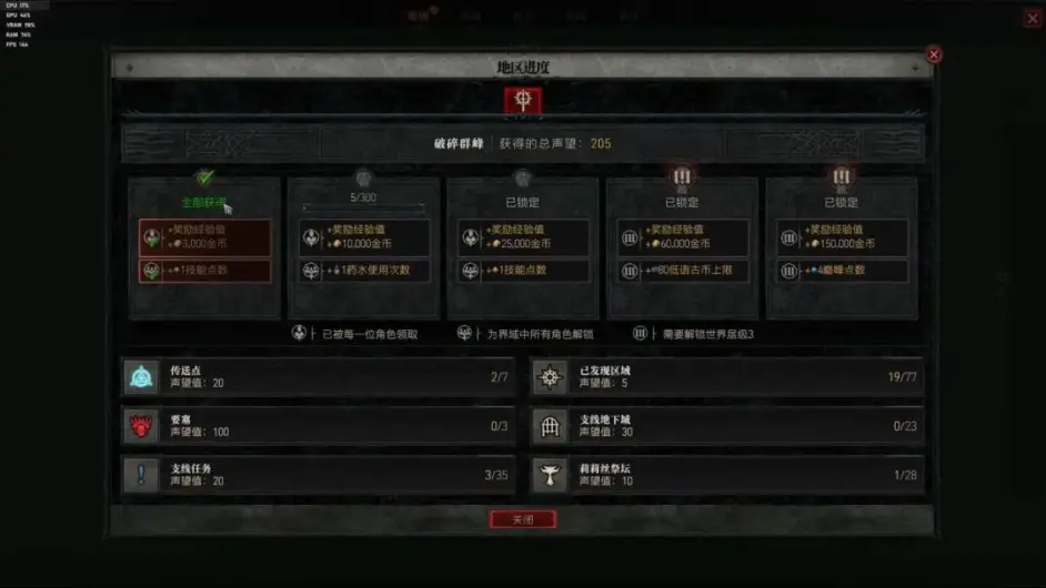 同時為了加強玩家的探索體驗,《暗黑4》將探索玩法融入到了地區聲望中,無論是找到傳送點,發現區域還是完成支線任務探索支線地下城,玩家都能收穫一定量的探索聲望,並通過探索聲望點數來解鎖對應的獎勵。就目前開測的第一張地圖破碎群峰,就已經提供了35個支線任務,77塊探索區域以及23個地下城。