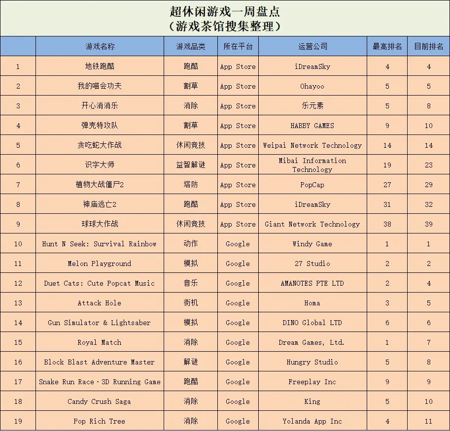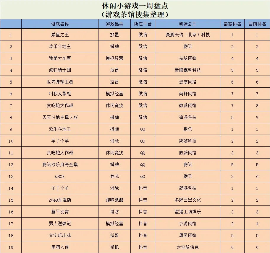 休閒新遊週報每週統計微信小遊戲、QQ小遊戲、抖音小遊戲、硬核小遊戲以及App Store和Google Play上的新遊爆款,並按照分類製作表格,將遊戲排名情況等資訊公佈,希望給到行業同儕幫助。本週統計資料擷取3月13日到3月19日各大平臺榜單排名情況,共製作休閒小遊戲、超休閒遊戲和重度H5遊戲三項排名表格。休閒遊戲方面,在微信小遊戲平臺,《瘋狂騎士團》穩坐人氣榜TOP5,《世界彈球王者》躋身榜單TOP6;在QQ小遊戲中,榜單頭部產品變化不大,《歡樂鬥地主》穩坐熱玩榜魁首;抖音小遊戲中,《2048加強版》排名回升,再次衝上熱門榜單第2名。超休閒遊戲方面,在App Store免費遊戲榜單中,Ohayoo發行的又一款割草遊戲衝上榜單TOP5;Google Play免費遊戲榜單中,躲貓貓玩法的動作遊戲《Hunt N Seek: Survival Rainbow》再次登上魁首,27 Studio旗下的模擬遊戲《Melon Playground》衝上榜單第2名。重度遊戲方面,QQ小遊戲榜單中,三七網路《斗羅大陸》重回QQ重度小遊戲榜單魁首,《愛江山更愛美人》排名上升,重回暢銷榜單TOP10;硬核小遊戲中,傳奇類小遊戲《君臨傳奇》連續第二週穩坐硬核重度小遊戲魁首,《英雄訓練師》和《天劍奇緣》緊隨其後,分別位於榜單第3和第4名。休閒小遊戲:《世界彈球王者》衝榜TOP6,《2048加強版》重回TOP2