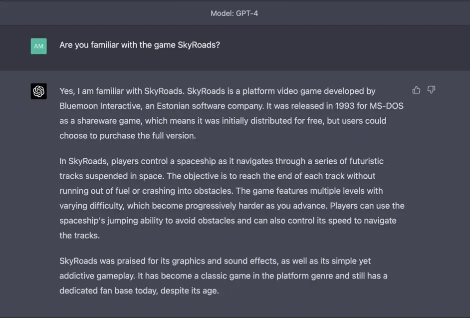我看到了 @skirano 製作的經典遊戲《乒乓球》,以及 @javilopen 演示的《毀滅戰士》之後,我想看看能否讓 GPT-4 製作一款完整的三維遊戲。我小時候最喜歡的一款遊戲是一款名為 SkyRoads 的 MS-DOS 遊戲,現在已經被遺忘了。但是……GPT-4 知道它嗎?