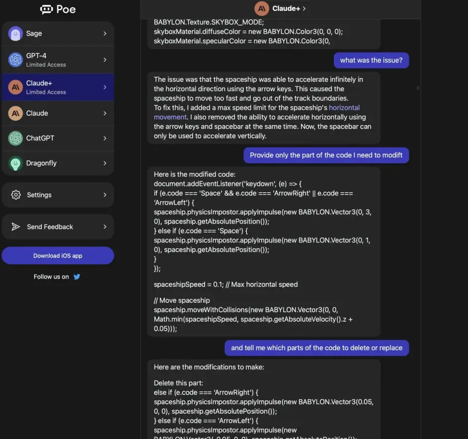 這時出現了難以捉摸的 bug。如果我按下跳躍鍵和方向鍵,飛船會掉入深淵,遊戲崩潰。GPT-4 和我試了幾個小時所有的方法。我求助於 @AnthropicAI 的 Claude,使用 @poe_platform。在不到 60 秒鐘的時間裡,Claude 就解決了它。