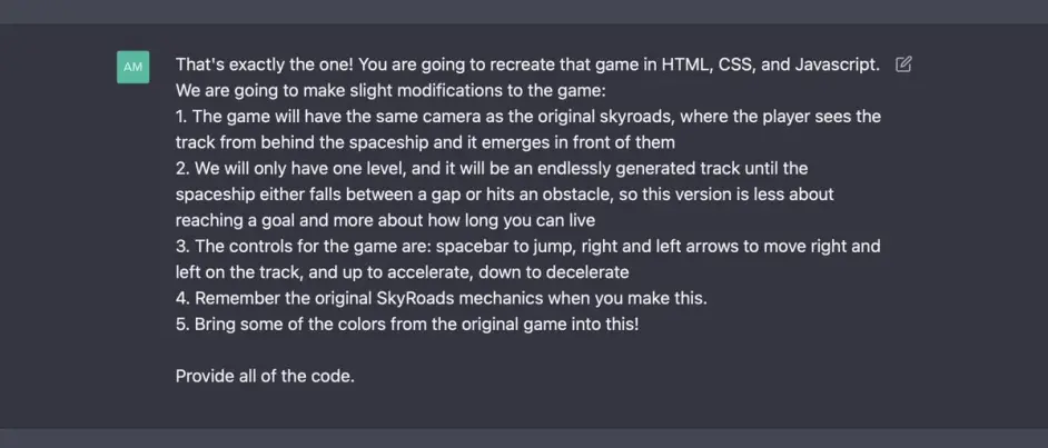 然而,我不知道如何編寫一行三維遊戲程式設計程式碼,所以我讓 GPT-4 挑選出它將如何製作這個遊戲,它建議使用 BabylonJS、HTML 和 CSS。然後,我準確地描述了我們會從 SkyRoads 借鑑什麼,以及這個版本會有什麼不同——提示: