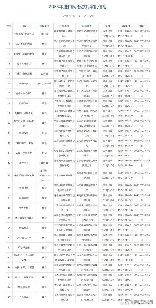 這批版號雖然數量上不多,但型別相當豐富,並且還有不少外服目前大火的遊戲,比較值得關注有以下幾個:b站的《閃耀!優俊少女》,也就是《賽馬娘》;悠星的《蔚藍檔案》,也是我們常說的《碧藍檔案》;NS上的老遊戲《妖怪手錶4強化之章》;大宇中手遊的《仙劍客棧2夢迴餘杭》以及網易的《勁舞團:全民派對》。