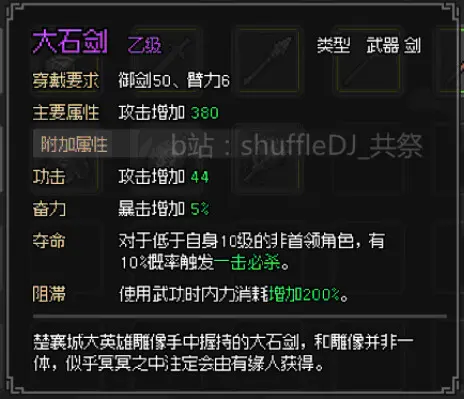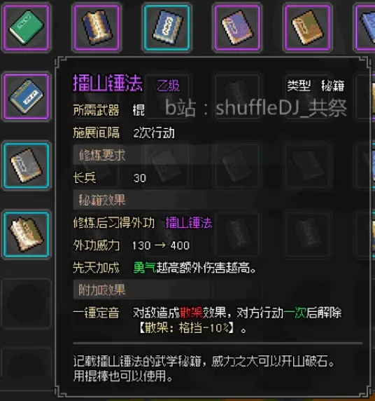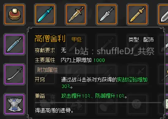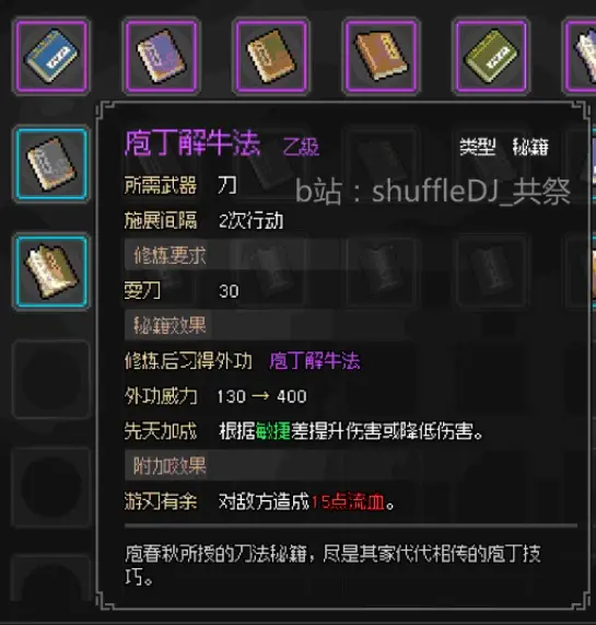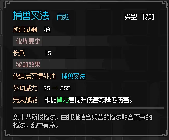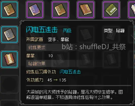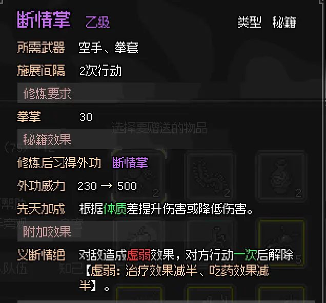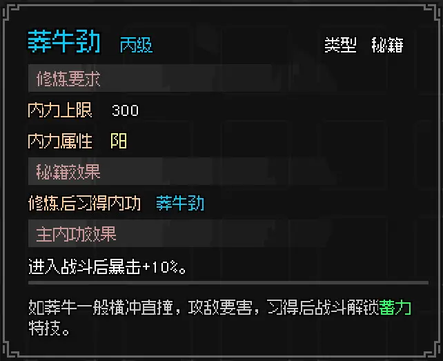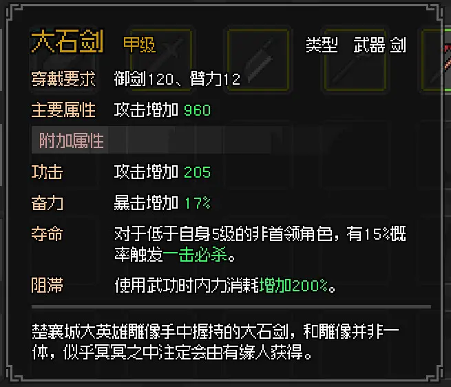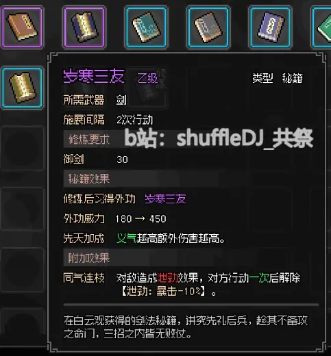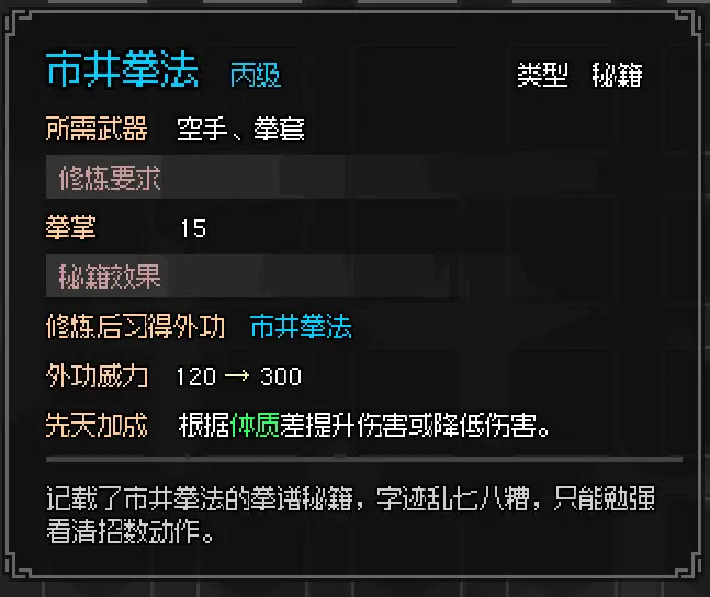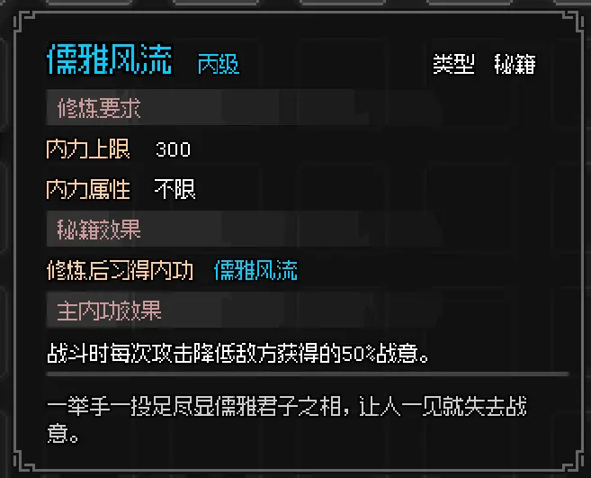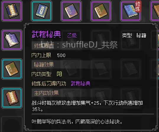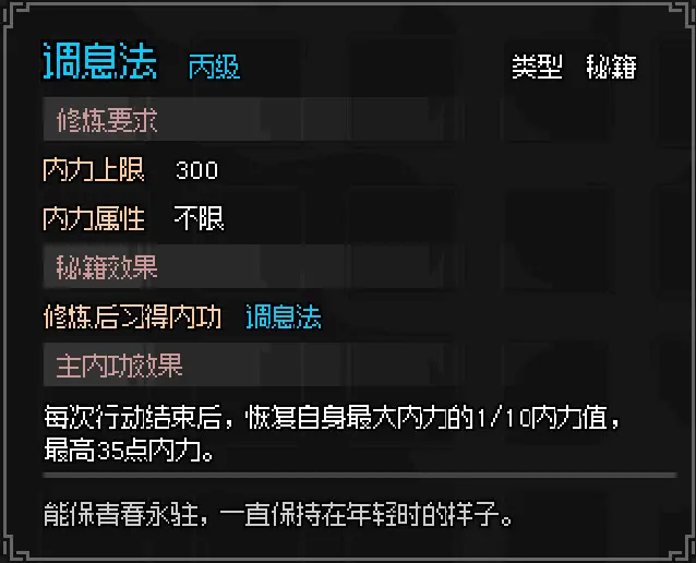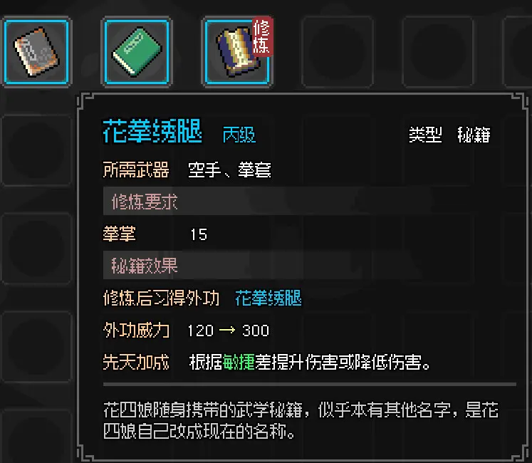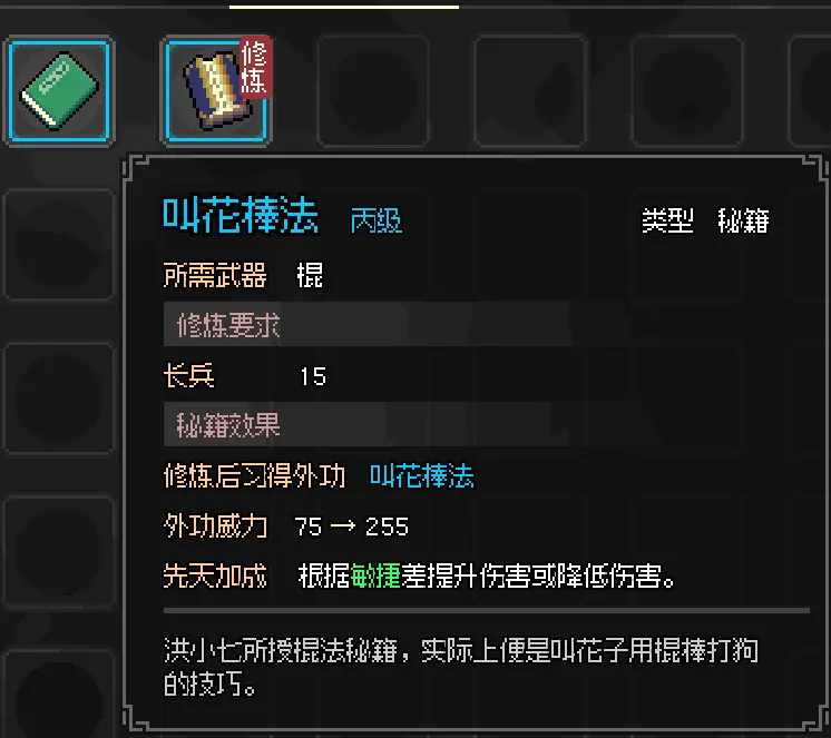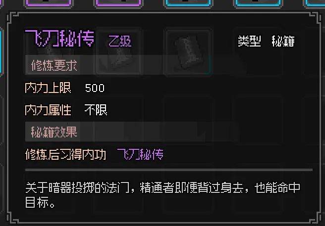 可以鑑定出隨機藍色武功 暫時沒發現啥用 不排除以後有什麼逆天的藍色功法(補充 已經發現有很多實用的功法了 比如補200暗器的心法 補短兵數值的書等)
