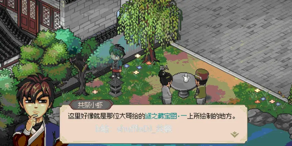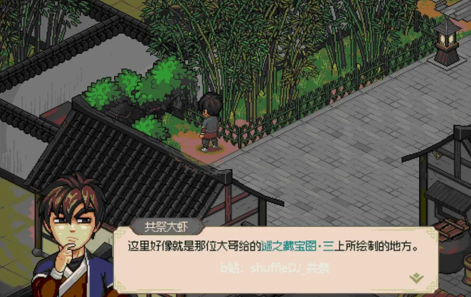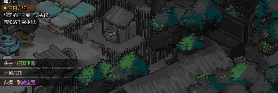 村長家右邊的柴堆按下方攻擊打碎 進去可以用銅鑰匙(屠戶邊上的柴堆拿)開啟寶箱拿藏寶圖