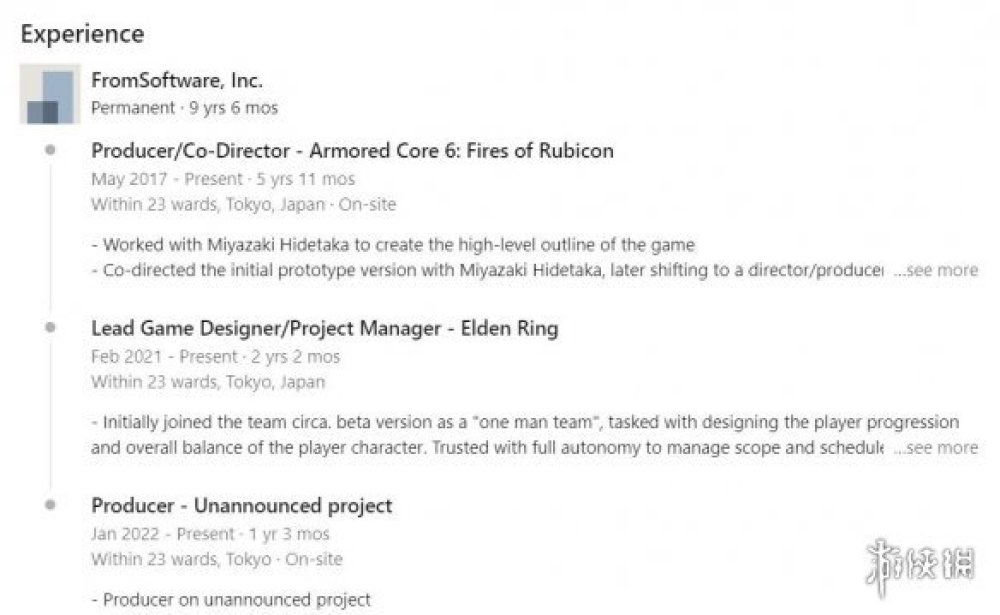 據外媒PCGamesN報道,FS社製作人Kenneth Chan的個人履歷頁面上顯示:他從2022年1月至今都在管理一個“尚未公開的專案”。此外頁面還顯示他從2017年至今擔任《裝甲核心6》製作人/聯合總監,在2021年至今擔任《艾爾登法環》設計師/專案經理。