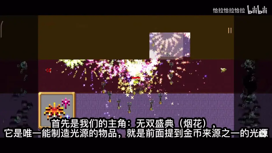 首先是我們的主角無雙盛典煙花,它是唯一能製造光源的物品,就是前面提到金幣來源之一的光源,同時它和XV-黃金迪斯科配合,可以幾乎全程保持淘金熱,成為金幣來源之二。但是由於沒有其他特殊機制超高蛋時它只能當做光源製造機,殺怪效率低下。