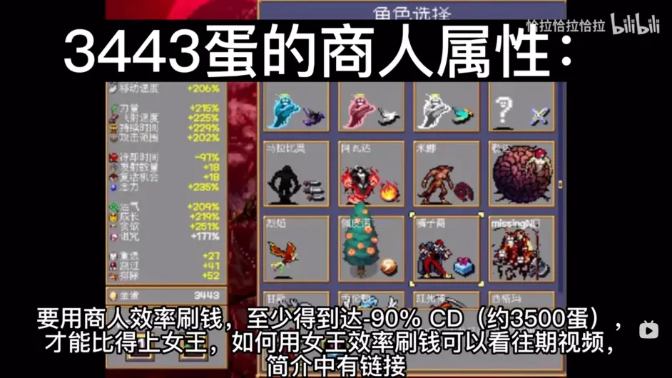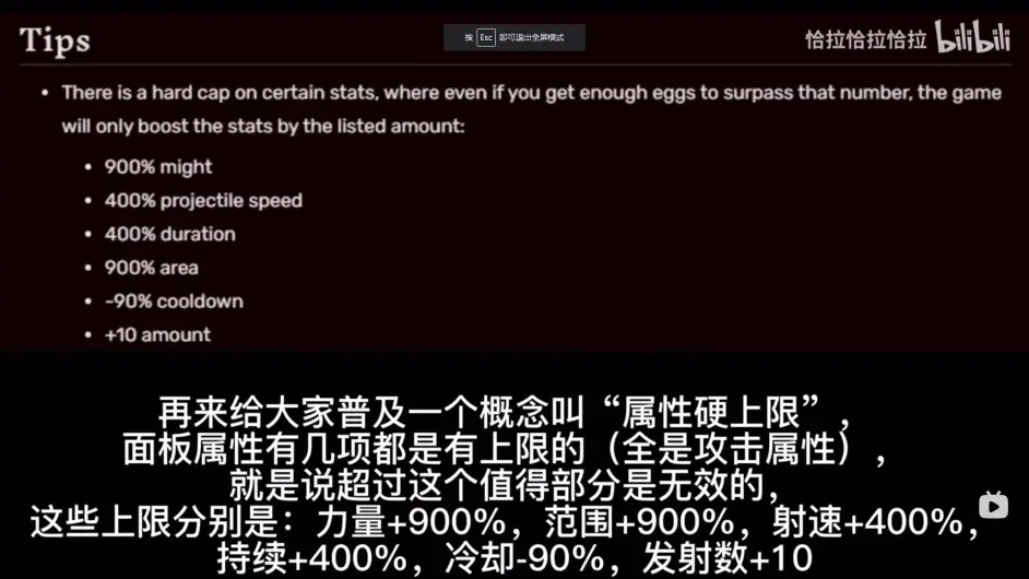 再來給大家普及一個概念叫屬性硬上限:面板屬性有幾項都是有上限的(全是攻擊屬性),就是說超過這個值的部分是無效的。這些上限分別是:力量加900%、範圍加900%,射速加400%、持續加400%,冷卻-90%、發射數加10。這就會導致一個問題,在達到上限之後,如果繼續吃蛋,因為詛咒沒有上限還在提升,怪就會變得越來越難殺死。所以當蛋高到一定程度的時候,就需要特殊解法來對付怪,甚至放棄殺怪的途徑來獲得金幣。