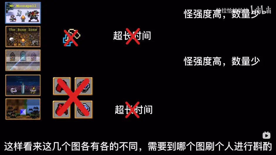 接下來我們來說說地圖,就金幣倍率來說,月咒山和埋骨的並列第一,大教堂第二,小橋流水和蝙蝠國第三,就可以使用的武器來說,小橋流水和蝙蝠國因為沒有箭頭和戒指的原因,不能使用緋紅聖骸布和無盡迴廊。埋骨地因為光源只掉落金幣的原因不能使用玫瑰念珠。埋骨地和蝙蝠國有特殊效果,每分鐘增加怪物速度和血量,所以不適合超長時間殺怪掛機。然而大教堂和月咒山的怪物強度可以說是幾個圖裡面最高的,但是數量並不多。這樣看來,這幾個圖各有各的不同,需要到哪個圖刷個人進行斟酌。