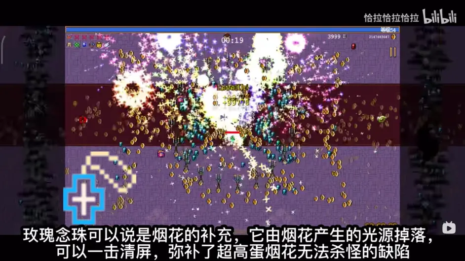玫瑰念珠可以說是煙花的補充,它由煙花產生的光源掉落可以一擊清屏,彌補了超高蛋煙花無法殺怪的缺陷。