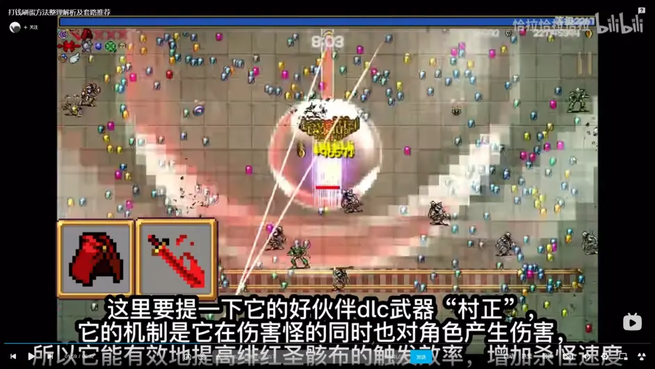 第二位就是緋紅聖骸布,它有一個特殊機制,怪打角色越疼,它的反傷就越高,也就是它的傷害是隨著詛咒提升的,所以即使後期怪血量再高也能秒殺。這裡要提一下他的好夥伴 DLC 武器村正,他的機制是他在傷害怪的同時也對角色產生傷害,所以他能有效地提高緋紅聖骸布的觸發效率,增加殺怪速度。但是它有個致命缺點,就是必須要拾取寶箱和地面道具才能進化出來,這導致超高彈蛋根本無法進化出它。