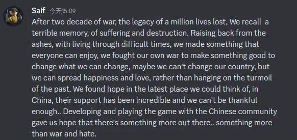 After two decade of war, the legacy of a million lives lost, We recall a terrible memory, of suffering and destruction. Raising back from the ashes, with living through difficult times, we made something that everyone can enjoy, we fought our own war to make something good to change what we can change, maybe we can't change our country, but we can spread happiness and love, rather than hanging on the turmoil of the past. We found hope in the latest place we could think of, in China, their support has been incredible and we can't be thankful enough.. Developing and playing the game with the Chinese community gave us hope that there's something more out there.. something more than war and hate.