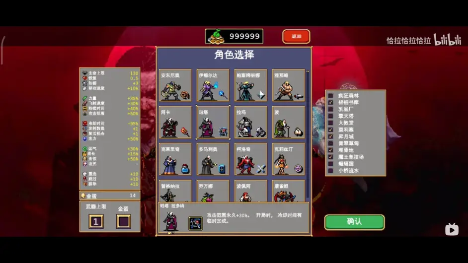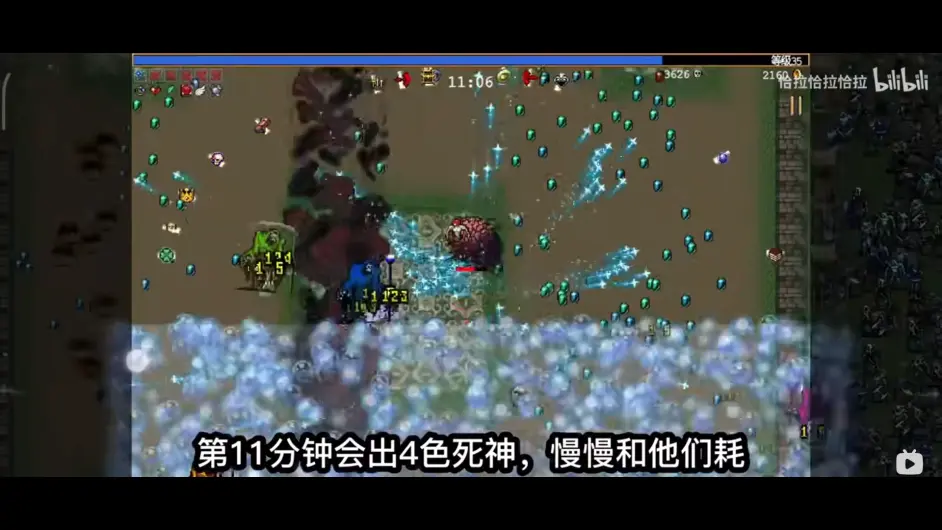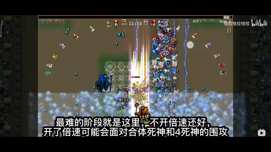 快到 11 分鐘的時候要到上半場,不然就會來洪水被淹死了。最難的階段就是這裡不開倍速還好,開了倍速可能會面對合體死神或似死神的圍攻,但是由於鎖一級,死神的血會很少,吃幾下閃電就都死了。這裡要說明一下,用別的角色到 12 分鐘開始就覺得打不動怪了,那是因為從 12 分鐘開始重新整理的怪都是根據玩家現在的等級乘以機除血量的,特別到 14 分鐘最後一波會特別肉,所以鎖一級在這裡會很吃香,即使是最後一波也是瞬秒。