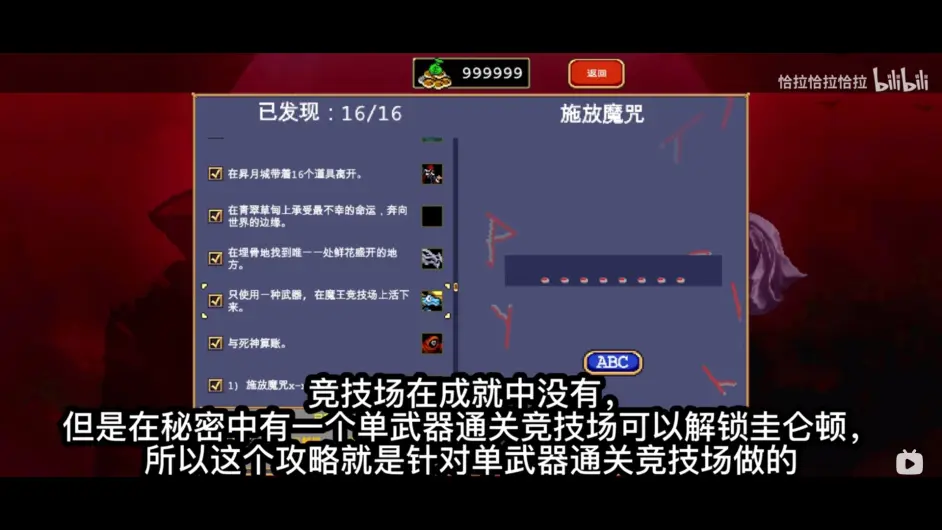 競技場在成就中沒有,但是在祕密中有一個單武器通關競技場可以解鎖歸倫頓,所以這個攻略就是針對單武器通關競技場做的。