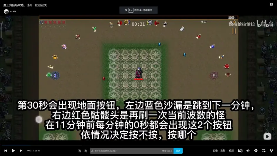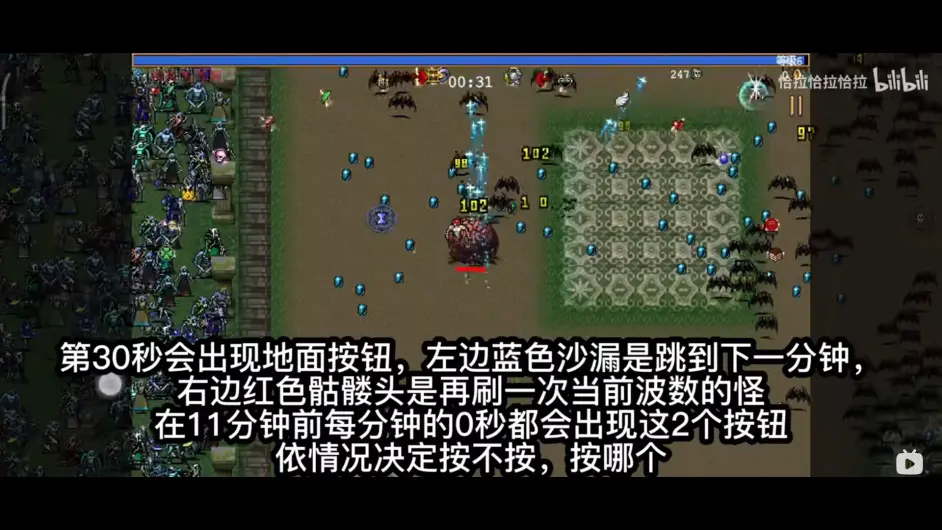 第 30 秒會出現地面按鈕,左邊藍色沙漏是跳到下一分鐘,右邊紅色骷髏頭是在刷一次當前波束的怪,在 11 分鐘前,每分鐘的30秒都會出現這兩個按鈕,按情況決定按不、按哪個。有寶箱就撿。第 5 分鐘出紫色寶箱的卡牌選擇XI-珍珠的圓舞曲或者IV-甦醒增加容錯。