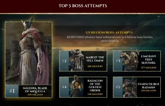 根據統計,老頭環玩家挑戰boss的次數將近60億,其中排名第一的瑪蓮妮亞就高達3億2900萬次,第二的惡兆2億8100萬次,第三的大樹守衛多達2億7700萬次,拉達岡1億4800萬次,碎星1億3千900萬次。