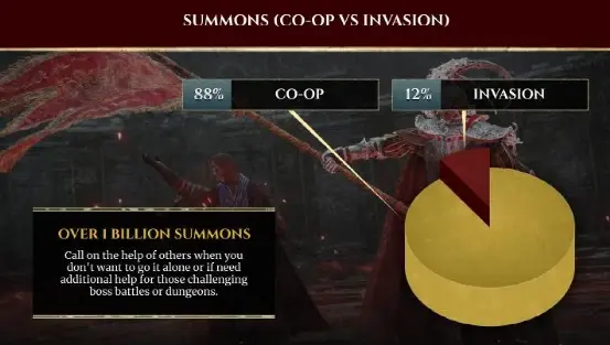 或許是因為老頭環戰鬥手感較差、法術技能失衡,根據統計,雖然老頭環玩家有超過10億次連線,但是88%是搖人合作,只有12%是入侵。