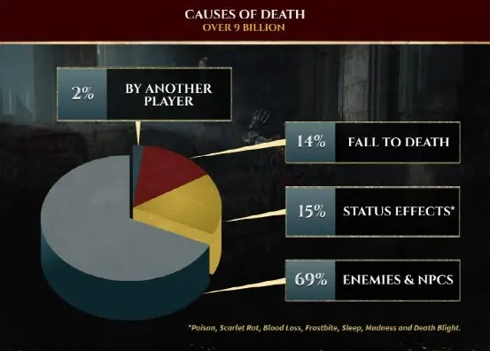 這個資料來自遊戲發行商萬代南夢宮自己釋出的《艾爾登法環》資料統計,與死亡數一起釋出的,還有諸如死亡原因、boss挑戰次數、玩家使用最多的法術、奇蹟等。