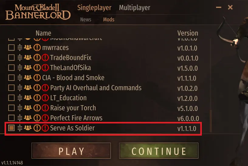 1、下載好對應版本檔案後,將壓縮包中的“ServeAsSoldier”檔案解壓或者拖拽至騎砍2根目錄的Modules資料夾中。