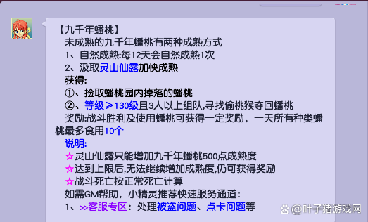 估計很多玩家都不知道蟠桃園新玩法,每隔12天蟠桃園會掉落成熟的九千年蟠桃,拾取之後吃下去有機會獲得高階獸訣!當然,如果你是五開玩家且等級大於130,那就更方便了,直接定好月光飛進去通過刷怪獲得9千年蟠桃。