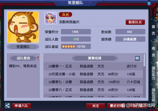 就目前笑裡猴團隊的戰績來說,雖然算不上頂尖,但能穩定在全服128強-64強左右,武神壇也能進入積分賽環節,算是目前成績相當不錯的戰隊了。不過,按照猴哥的風格,加盟的話還是建議備好“笑裡藏刀”特技比較好。