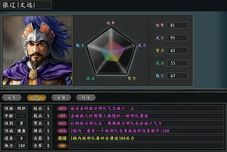張遼是可以入選此版本最強副將行列的武將,自身的特技效果都是非常優秀的,更不用說依靠遼來的特技效果,可以很好的壓制頂級武將在戰場上的瘋狂表現了。