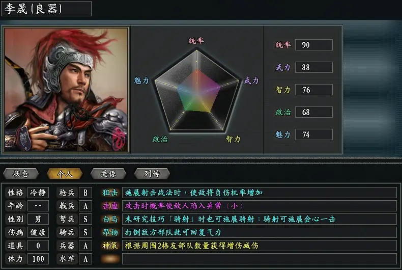 不過我們可以通過其他方法將概率進行一個提升。李晟的兵種是是弩兵和騎兵的雙 S 等級,特技中也有狙擊和白馬兩個分別屬於弩兵和騎兵的專屬特技,那麼他到底要選擇哪個兵種呢?