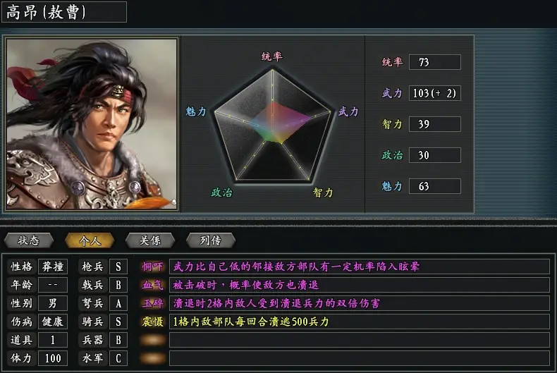 高昂和王彥章一樣,除了在自身部隊潰退的時候會給敵軍部隊造成一定的麻煩和困擾之外,他在戰場上的綜合能力也是可以的,他自身雖然不具備像王彥章那樣穩定的硬控能力,但是卻有恫嚇和震撼兩個貼身特技,一個有概率眩暈敵軍,另一個則能夠每回合開始固定對敵造成 500 的傷害,而且面對被自己眩暈住的敵軍,還有初始寶物附加的要擊特技,能夠提升對處於異常狀態部隊的傷害。