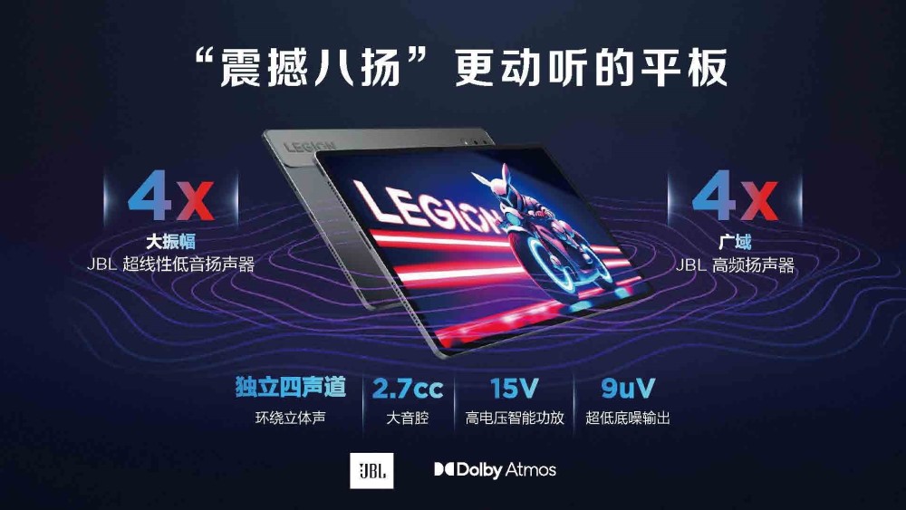 在聯想悅聲科技加持下,Y900通過八枚特殊調校的JBL揚聲器——4個超線性低音單元和4個超寬頻高音單元組合,使低音更渾厚,高音更透徹。同時適配了愛奇藝、優酷、嗶哩嗶哩等主流視訊平臺APP的最高畫質。Y900還支援杜比視界和杜比全景聲,讓畫面更精緻鮮活,聲音更真實沉浸,Y900致力於打造平板電腦影音體驗新標杆。