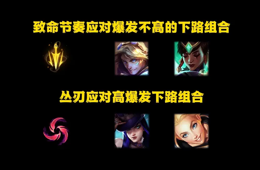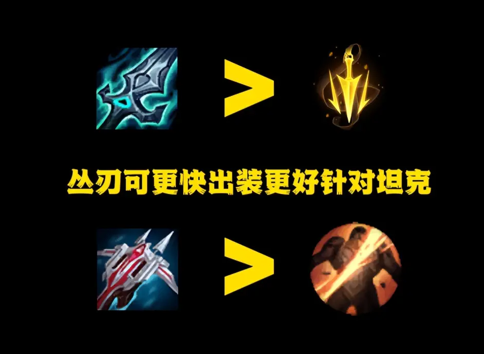 如果下路打起來雙方活不過五秒,就需要無腦選擇叢刃。比如對手下路為女警+拉克絲這一爆發拉滿的組合。就算對手上中野為塞恩豬妹加里奧坦度拉滿,也要優先考慮叢刃穿甲的玩法。畢竟破敗、大穿甲等裝備對切坦的幫助,是完全要比致命節奏+砍倒來得大。