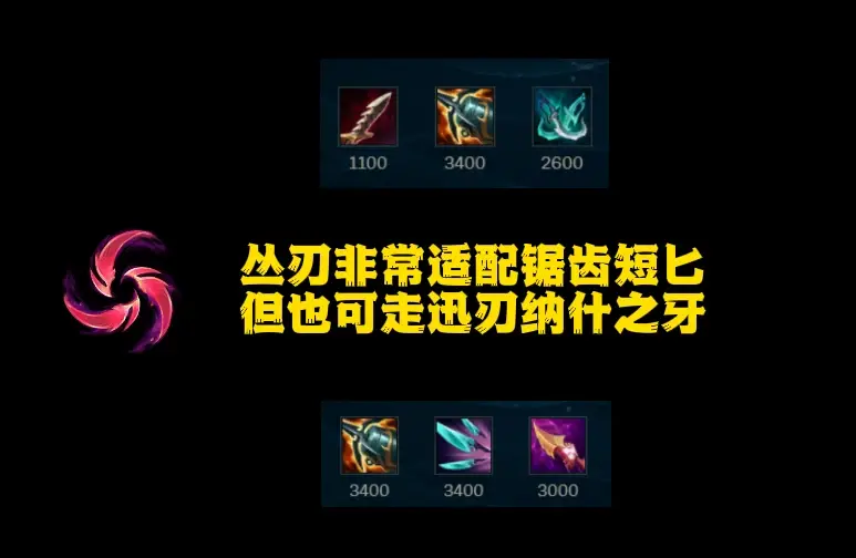 不過雖然說鋸齒短匕對叢刃卡莎的提升更多。但是在當前版本,也可以走海妖、迅刃、納什三件套。這樣可以利用迅刃重新整理W來提升poke能力,在對手偏脆的時候配合叢刃也非常好用。