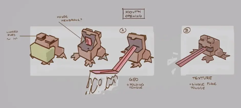 負責青蛙設計的開發者Chi Wong告訴我們:剛開始我們覺得體型大的青蛙設計很完美,直到加入遊戲之後才發現它真的太大了。第一它沒有辦法趴在睡蓮上;第二太大的青蛙給人一種巨物恐懼感,不那麼可愛也不那麼貼合實際。
