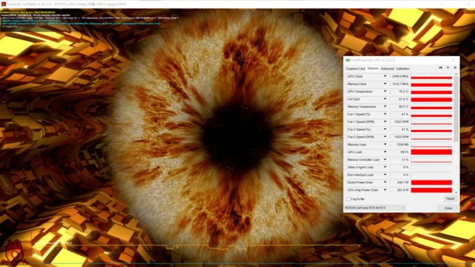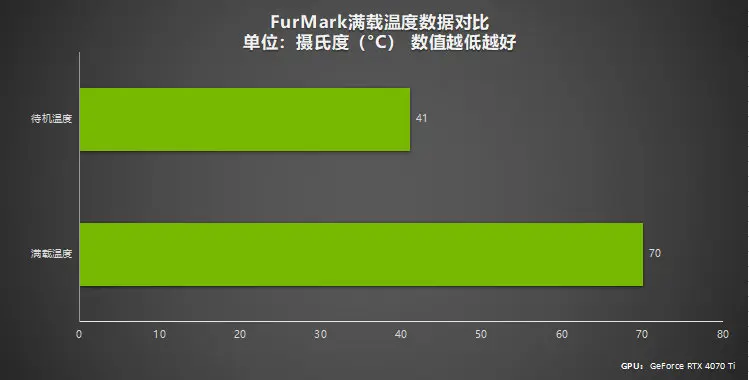 使用FurMark軟體來測試 耕升 GeForce RTX 4070 Ti 星極幻姬的待機溫度和滿載溫度監控。從測試資料可以看到,在待機溫度下,耕升 GeForce RTX 4070 Ti溫度為41°C;而在開啟負載軟體壓榨GPU後,等待溫度與功耗表現穩定後,測得滿載的情況下溫度為70°C,處於正常可控範圍之內,不會出現溫度過高。