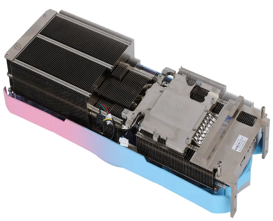 高效散熱不僅需要加強扇葉,還需要散熱鰭片與熱導管來輔助散熱。耕升 GeForce RTX 4070 Ti 星極幻姬使用了8 根6mm複合式鍍鎳熱導管與大面積緊密散熱鰭片設計,來增強散熱效能。鍍鎳熱導管可以加強抗氧化能力,延長熱導管使用壽命。大面積緊密散熱鰭片能更高效增強散熱速率,兩者相輔相成能很好地將熱量傳遞出去,延長GPU壽命。