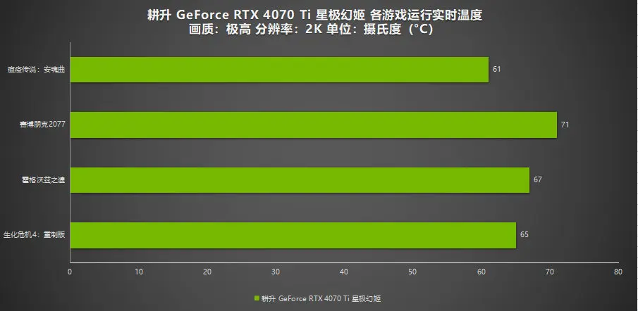 從遊戲測試可以看出,在2K解析度畫面設定最高情況下,GPU負載能達到99%,將近滿載。而待遊戲穩定執行後測量GPU溫度可以得到資料:《瘟疫傳說:安魂曲》61°C,《賽博朋克2077》71°C,《霍格沃茲之遺》67°C,《生化危機4:重製版》65°C。其中《賽博朋克2077》因對GPU消耗較高,故實機測試溫度會更接近於FurMark滿載溫度。而其它遊戲執行溫度都在可控範圍內,耕升 GeForce RTX 4070 Ti 星極幻姬獨特的散熱設計即使在高畫質高解析度下依然能將遊戲效能和功耗溫度達到一個很好的平衡。