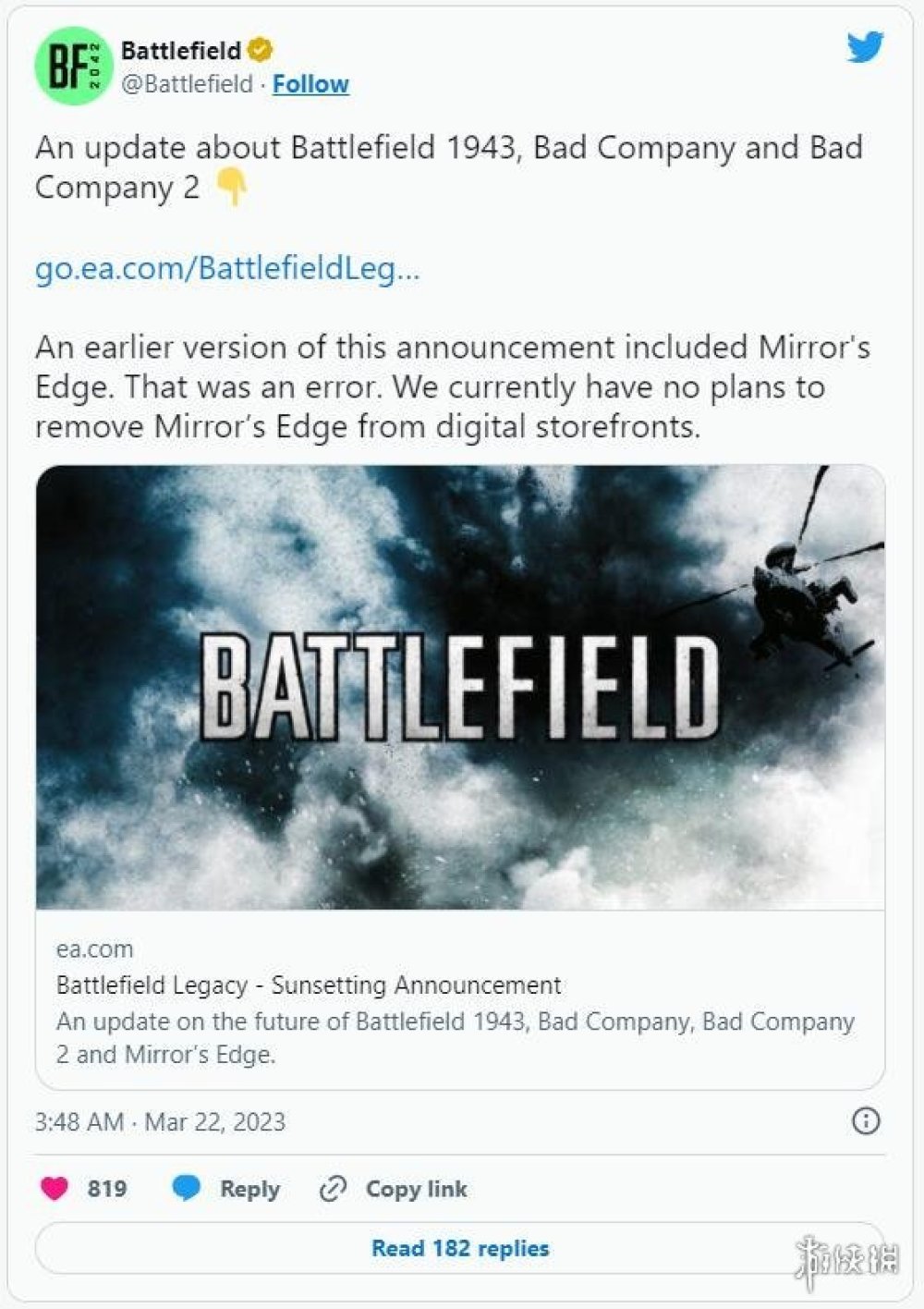 在早些時候的公告中,EA還表示《鏡之邊緣》也將會從數字商店下架,但後來他們澄清這是他們犯錯了,《鏡之邊緣》並不會下架。