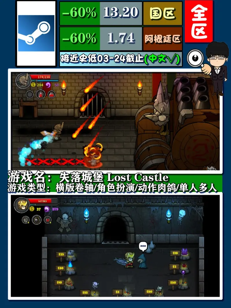 《失落城堡》,這個就不用老基德多做介紹了吧,聯機打怪,隨機角色,算的上是個打發時間的好遊戲,主要還是價位不高,且很耐玩,對於初次體驗玩家難度有些高,但重複多周目加點後會感覺到更多樂趣,另外遊戲一週目後可以選擇難度,刷無聊了也可以增加難度,體驗高難度下的更多高階裝備,相信會有不同感受