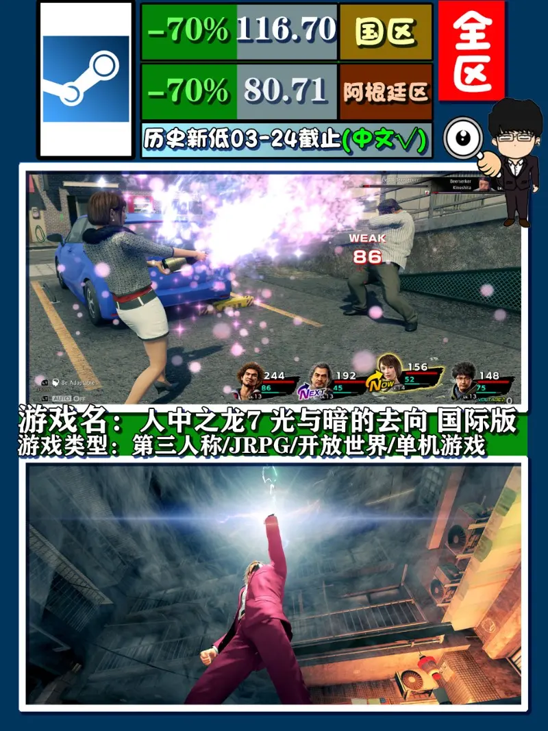 《人中之龍7 光與暗的去向 國際版》,典型日式RPG,熱血小人物翻身做大事,雖說原版IP名稱在國內都不能提及,但依舊是優秀作品之一,除了享受新主角帶來的故事體驗外,依舊保持著一貫的遊戲多元化,豐富性想必玩過的玩家不用多提,此次難得的歷史新低價位,對於等等黨們來說是個不錯的消磨時間好遊戲