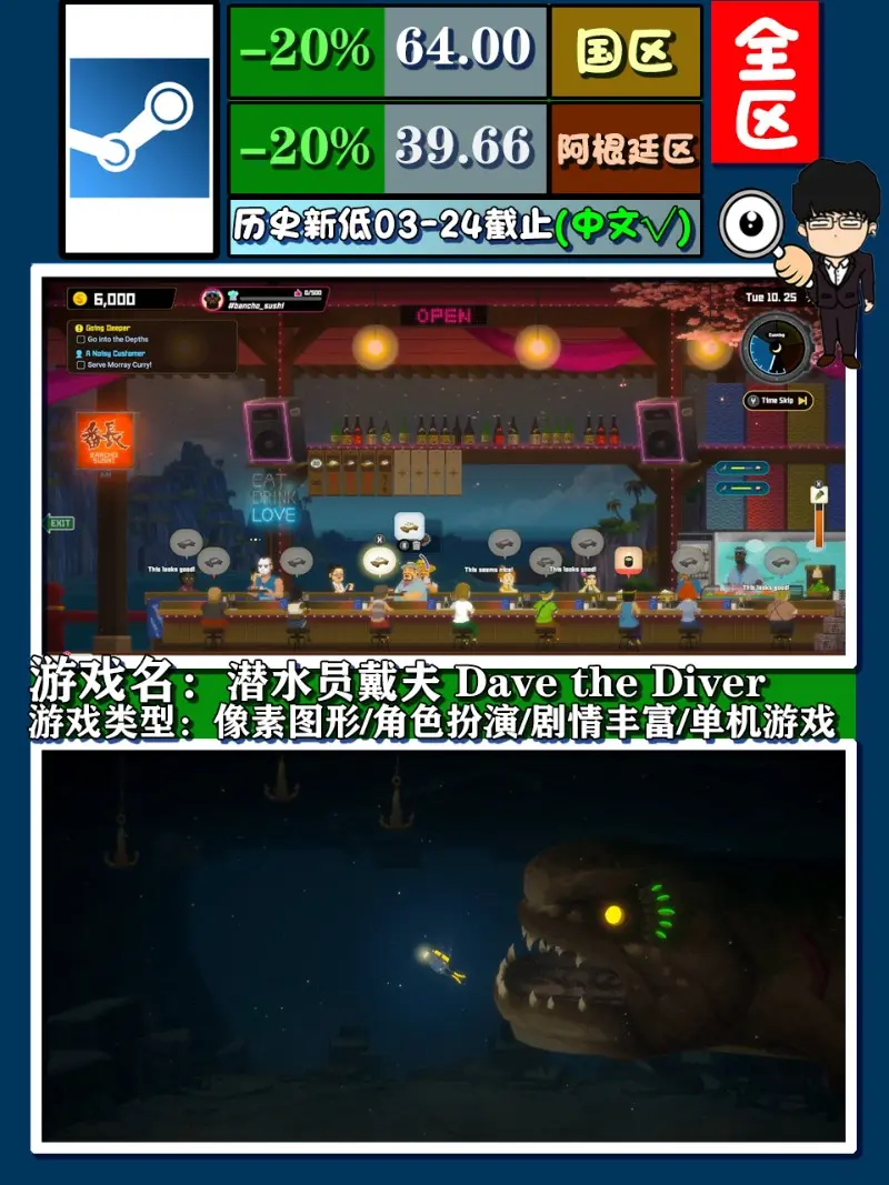 《潛水員戴夫》,與其說是角色扮演,更像是模擬經營,最大的樂趣莫過於深海潛水尋覓,壽司店內經營,目前版本的內容較不完整,至少官方確認了會出正式版,而此次是第一次的折扣期,所以老基德這邊推薦給喜歡這型別的玩家朋友們,如果是等等黨,到是可以考慮丟到願望單,等待開花結果
