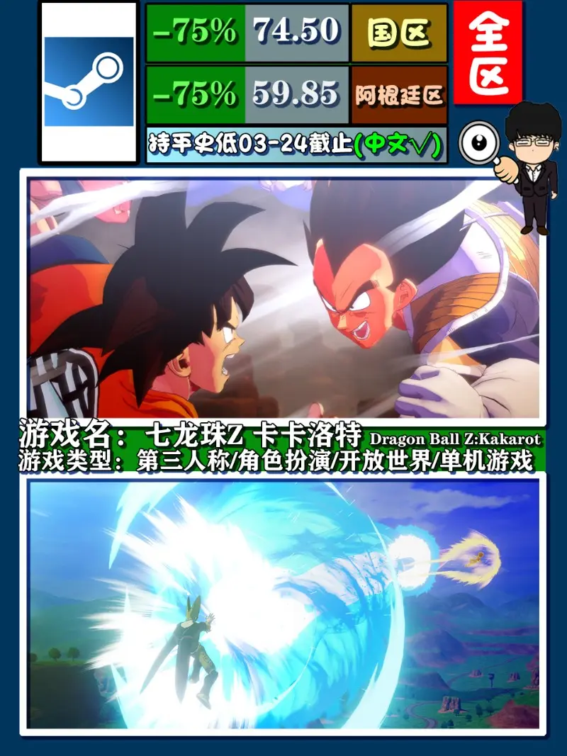 《七龍珠Z 卡卡洛特》,鐵粉推薦全DLC,享受推薦玩完本體,對於龍珠系列粉來說,早在過去CS模組裡面就出現過類似玩法,算的上是多年後廠商回饋給粉絲們的禮物,無論從打鬥還是從劇情上都是鐵打鐵的粉絲向遊戲,本身難度不高,但依舊熱血,值得考慮入手,更何況此次難得再次持平史低,等等黨們還在等什麼?