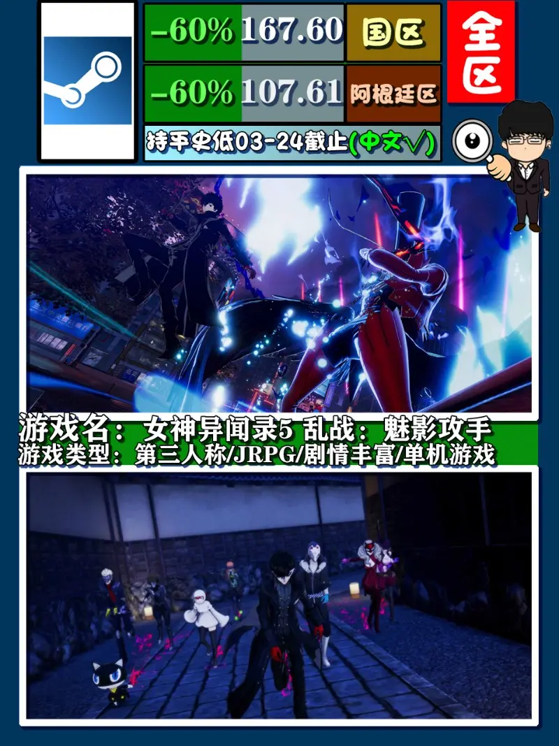 《女神異聞錄5 亂戰:魅影攻手》,作為P5系列的衍生作品,無論玩法割草爽快,還是劇情延續實在,想必在P5中與新老朋友可以再次攜手已經是眾多粉絲最愛的畫面,不過僅限鐵粉直入,對於衝著割草和動作遊戲的玩家來說,老基德建議謹慎購買,畢竟裡面的內容還是有很多放不開,更照顧到回合制玩家的需求