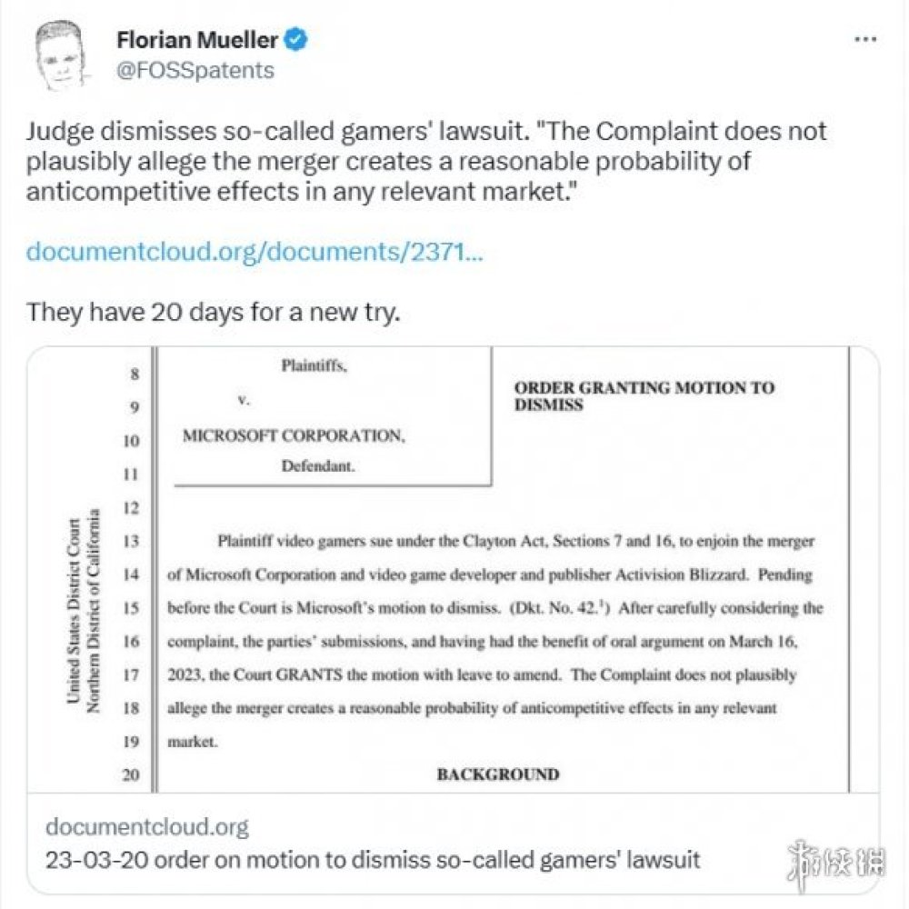 2022年12月份時,美國地區有一群玩家提起了針對微軟收購動視暴雪的反壟斷訴訟,理由是此舉會損害玩家利益、減少相關產品市場競爭,現在據知名市場競爭分析師 Florian Mueller 透露,該訴訟已被法官駁回。