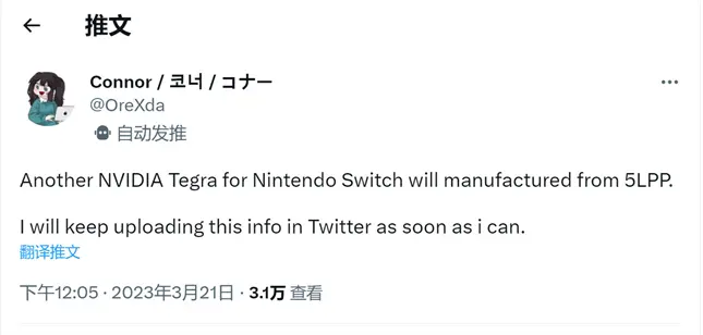 韓國舅舅黨 @OreXda 發推爆料:“任天堂 Switch 之後的下一代主機將使用新型英偉達 Tegra 晶片,該晶片採用三星 5nm 5LPP (5 納米低功耗 Plus)工藝鍛造。