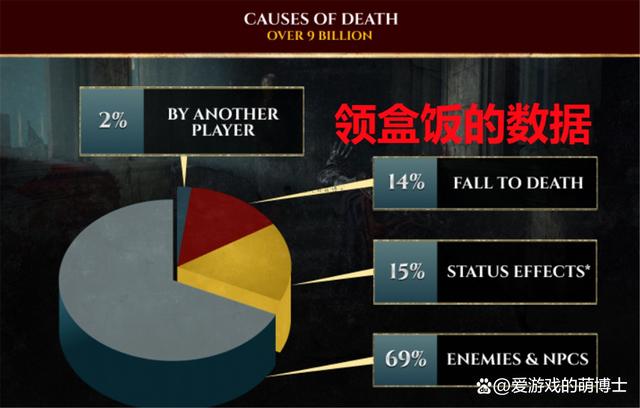 博士還留意到一個有趣的資料,那就是一年間千萬量級的玩家在遊戲裡領盒飯的次數超過90億次!至於原因方面,上述的BOSS(還有各類敵人、NPC)攻擊是大頭,佔據了69%。其他的包括:中毒、出血等狀態異常(15%)、墜落傷害(14%)、其他玩家的攻擊(2%)。宮崎英高的“善意”真是無處不在呀,玩家們摔死的次數居然如此之多。讓人沒想到!