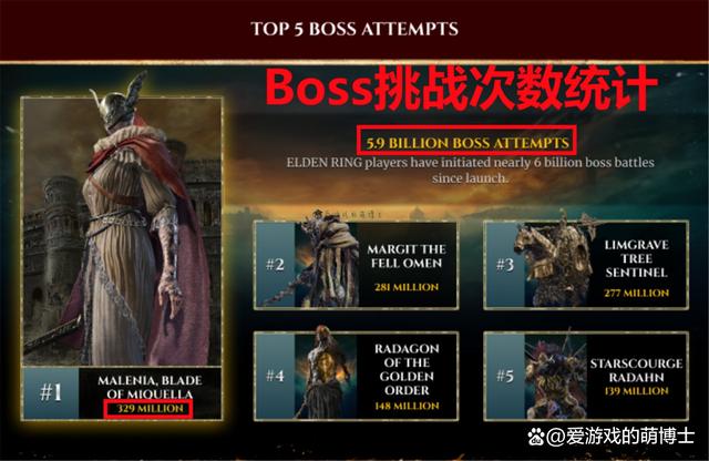 大家比較關心的Boss挑戰方面,在過去的一年間,玩家們嘗試去與各類Boss戰鬥了59億次,其中最受大家歡迎的Boss就是女武神瑪蓮妮亞,3.29億這個數字讓人歎為觀止!讓新手玩家苦惱不已的“惡兆妖鬼”瑪爾基特(2.81億)以及大樹守衛(2.77億)分列第二名和第三名。由於這些強大的頭目都不是吃素的,因此玩家挑戰的次數越多,意味著玩家死亡數越多。換句話來說,這三位都曾對《艾爾登法環》的玩家造成了嚴重的心理陰影。