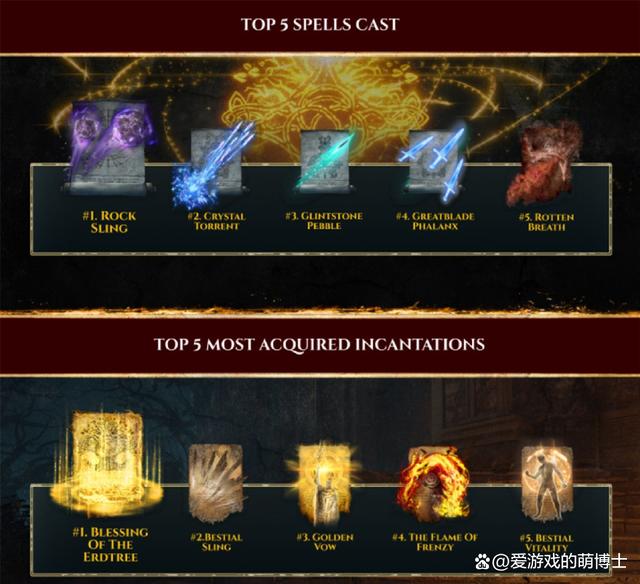 至於大家常用的法術TOP5分別是:岩石球、奔放結晶、輝石魔礫、巨劍陣和腐敗吐息;禱告施展TOP5分別是:黃金樹恩惠、獸石、黃金樹立誓、癲火和野獸活力。雖然《艾爾登法環》發售已經超過一年,但是玩家社群依舊很是活躍,上述的玩家資料引發了熱烈的討論,同時新DLC“黃金樹之影子”也讓大夥期待不已。