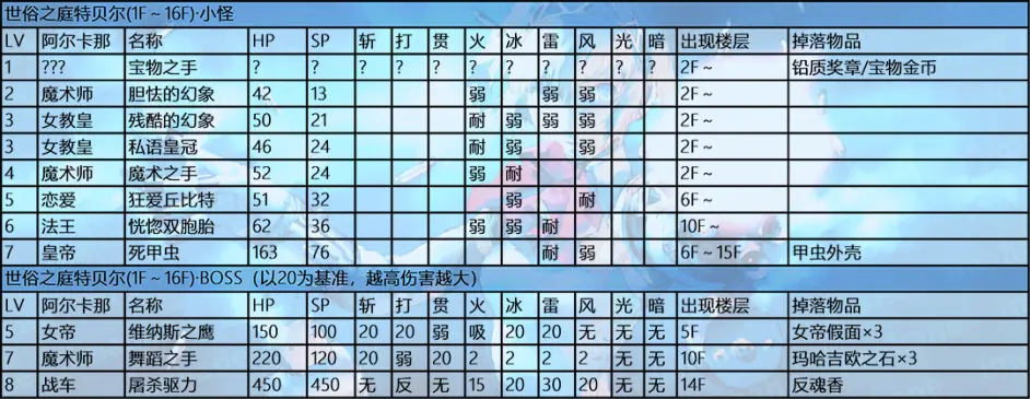 探索 塔內地圖自動生成隨機變化。不存在下樓樓梯,只可上樓。返回需要使用“脫離點”。返回入口大廳隊伍HP·SP全恢復。