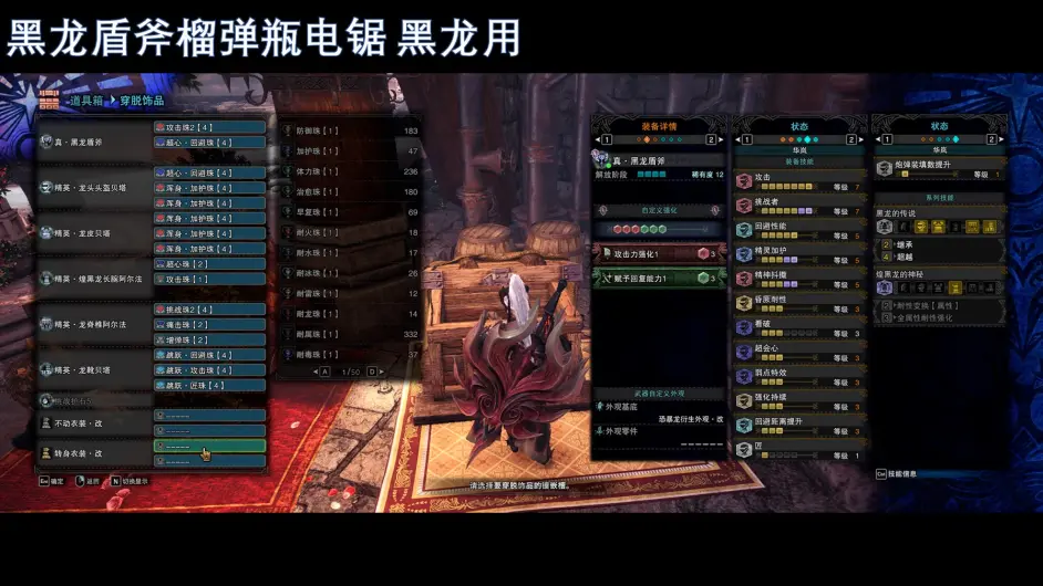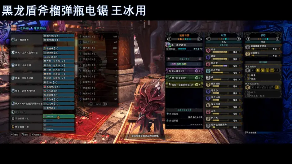 根據我統計的一些題材中的技能選擇,大概總結歸納了一下,不一定切中主題,代表個人觀點,範圍限定在黑龍四件配黑龍物理盾斧的範疇內,僅供參考: