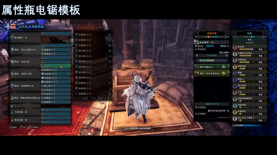 那麼如果對於站街百會並沒有需求,通過【弱點特效】提供會心的話,就可以留足大量孔位,也就是模板②,這套在調整少數技能後同樣可以作為屬性電鋸的配裝。