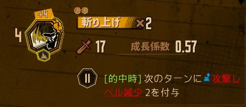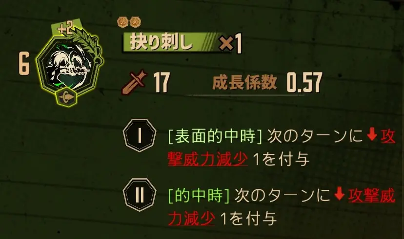 效果:I【投出正面命中時】下回合賦予物件1攻擊威力減少